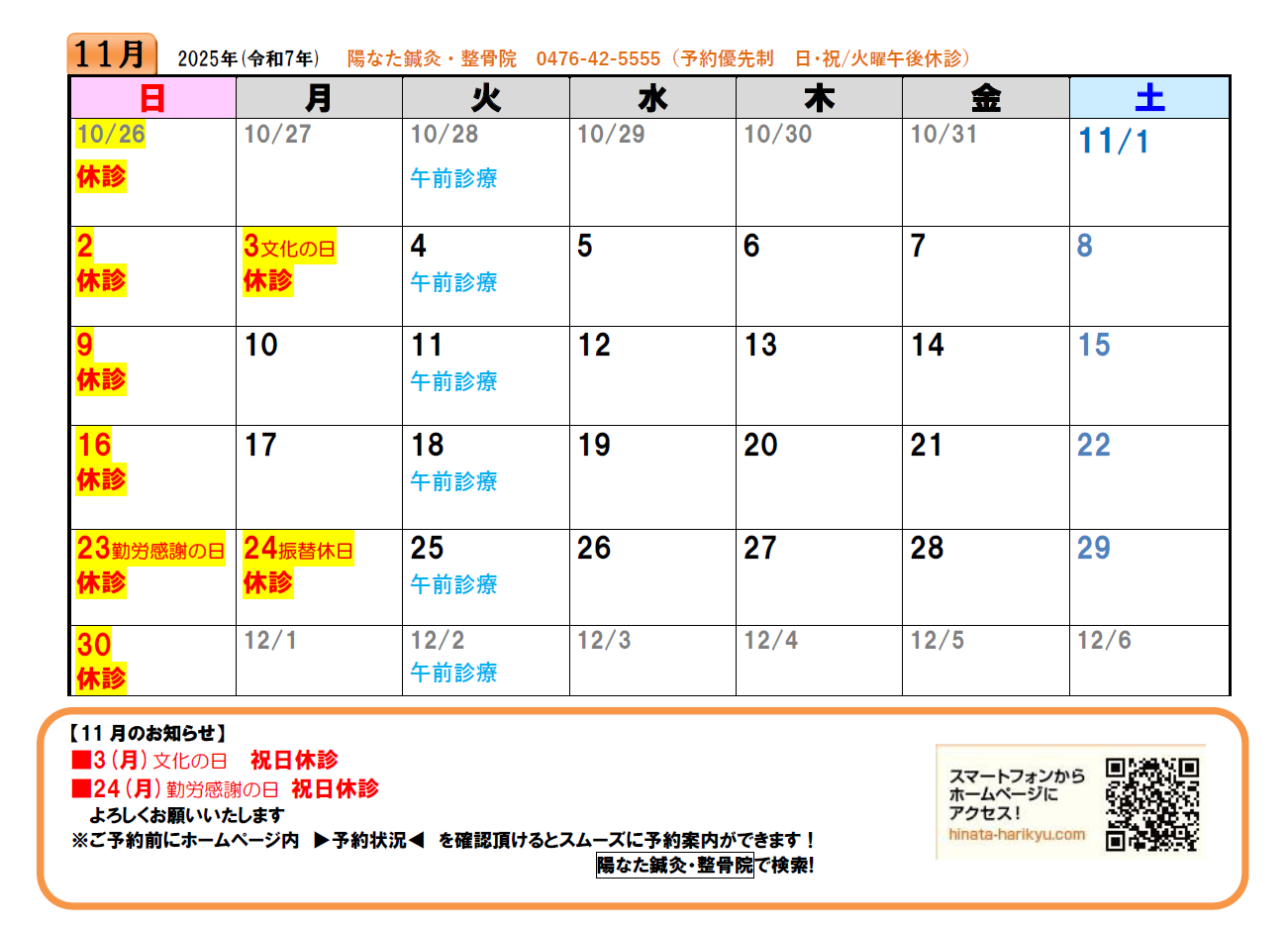 ■3(月)文化の日 祝日休診 ■24(月)勤労感謝の日 祝日休診 よろしくお願いいたします